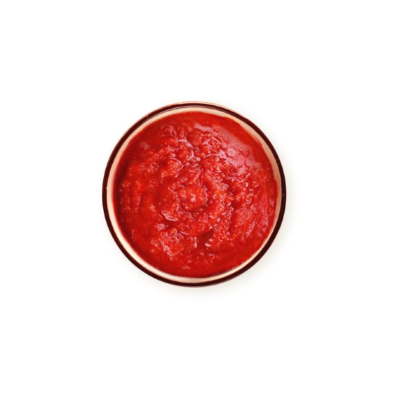 Υφή: Ψιλοκομμένη ντομάτα (polpa fine/fine-cut) σε κομμάτια ομοιόμορφου σχήματος αναμεμειγμένη με φυσικό χυμό ντομάτας.